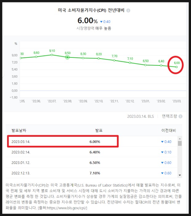 2023년 4월 12일에 발표한 미국 CPI는 5%로 전월에 비해 상승률이 1% 포인트 하락했다. 5%의 상승률은 예상 범위 내였지만, 미 연준의 경제팀이 발표한 올해 연말부터 완만한 침체를 예견한 자료로 인한 우려로 주가가 하락하였다.